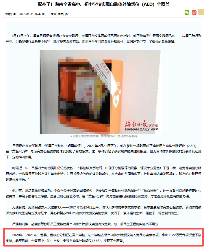海南:疫情期间,一个月内完成三亚、万宁200多所中小学的AED配置与培训。