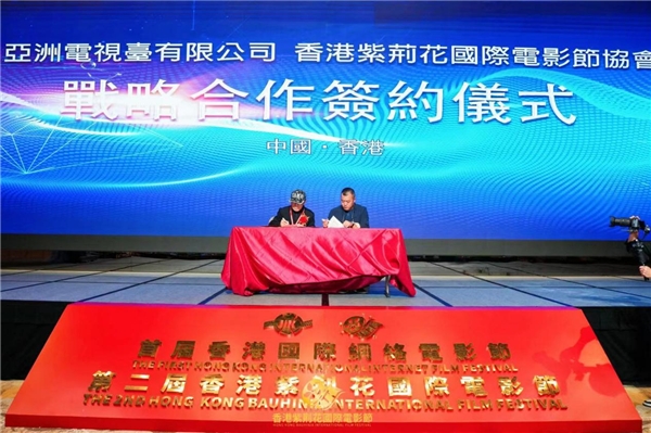 电影节上,亚洲电视台有限公司、香港紫荆花国际电影节协会进行战略合作签约仪式,著名书画家赵河山老师为第二届香港紫荆花国际电影节献上墨宝书画作品“紫荆花开”。
