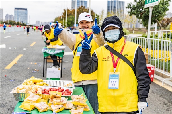 赛道沿途设置了多个补给站,同时赛事招募了众多跑团社会志愿者为全国各地的跑友服务,其中赛事补给有:香蕉、小面包、圣女果、能量胶、盐丸、蜜桔等。考虑到天气低温,特别在全马和半马完赛以后还为大家准备了姜汤热饮服务以及增设保温毯。也为跑友创造了更好的参赛体验,提供了更安全的赛事保障。