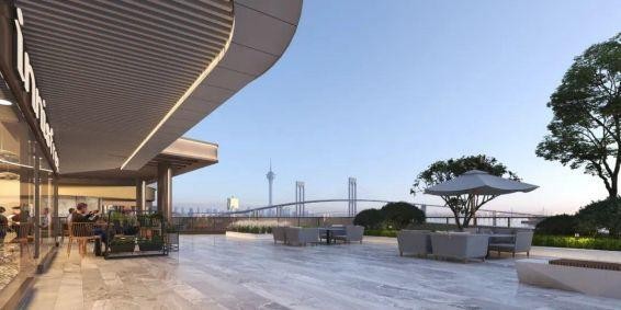 退台式空中花园的设计,充分回应场地景观资源,让整个景观设计再升华,形成向外延展的、多维立体的城市景观飘塔,宛若“城市风景台”,让人们在吃喝玩乐购之外、休闲之余,还能感受一线风光。
