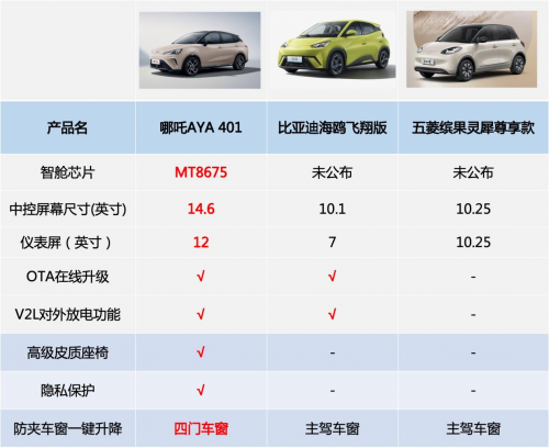 再看其他两款车型,比亚迪海鸥的屏幕尺寸仅为10.1英寸,从视觉上就不够拉风,智驾包的功能丰富度也不如哪吒AYA,数量还不到哪吒AYA的一半。五菱缤果虽然拥有双10.25英寸屏幕,但甚至没有配备OTA升级功能,也没有智驾包可选,尽管是顶配版型,但仍然只有ABS+EBD、ESC电子车身稳定系统等基础功能,相当没有性价比,购买还需谨慎。