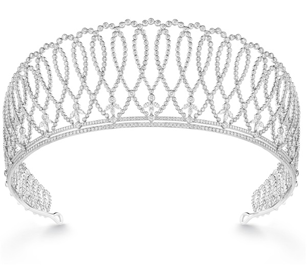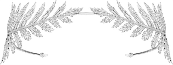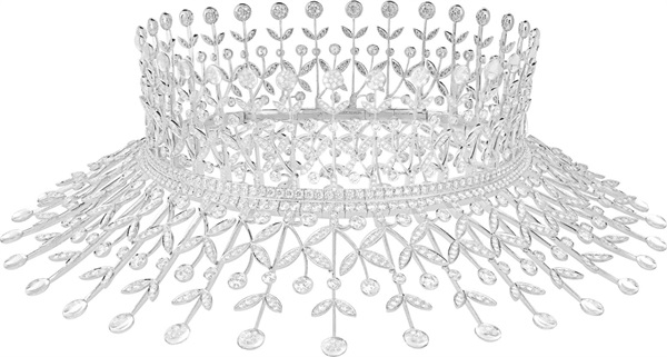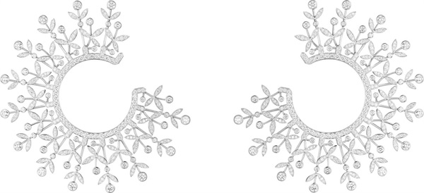 Boucheron宝诗龙还另外设计了一顶同主题镶嵌圆钻的白金冠冕和一对吊坠耳环。