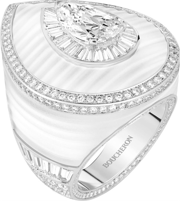 以纽扣元素为灵感原型,Boucheron宝诗龙还设计了一枚镶嵌一颗4.63克拉钻石(D VVS2)的磨砂水晶戒指,和一对长短可调节的吊坠耳环。
