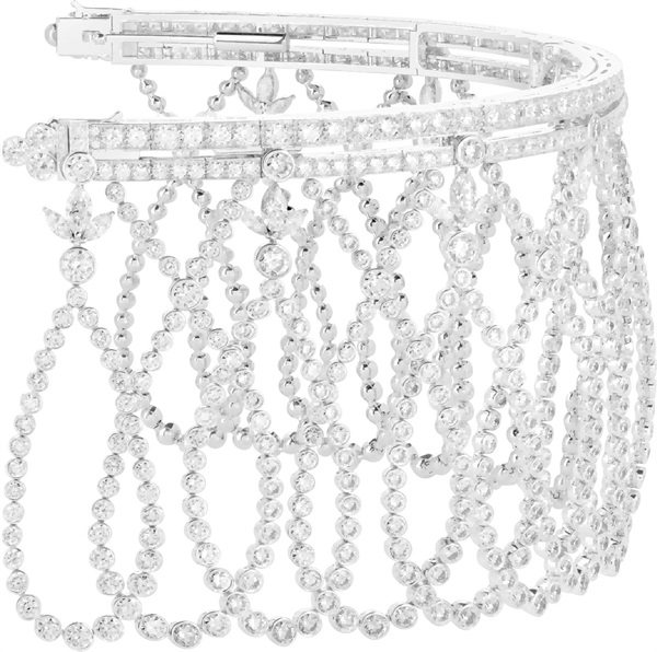 盛典礼服通常采用有型且贴合的高领设计,不仅突显颈部轮廓,亦象征着理性和直觉。在本次推出的Col主题作品中,这款衣领造型作品的设计灵感源自世家于20世纪打造的一顶冠冕,经巧妙设计后可作为一条由钻石和水晶制成、形似蕾丝造型的项链进行佩戴。这款赏心悦目的作品提供三种不同佩戴方式:当作为整体佩戴时,该作品同时结合了胸饰和短颈链,环绕于佩戴者颈间,白金与光线交织为网,为其增添耀眼魅力;此外,这件作品的胸饰和短颈链部分亦可以单独佩戴。