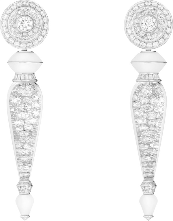 配套的一对吊坠耳环亦采用铺镶钻石的水晶打造,长短可调节。