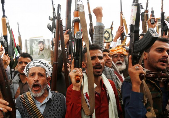 4月11日,数万民众在也门首都萨那参加游行集会,抗议美军对也门的空袭。新华社发(穆罕默德·穆罕默德摄)