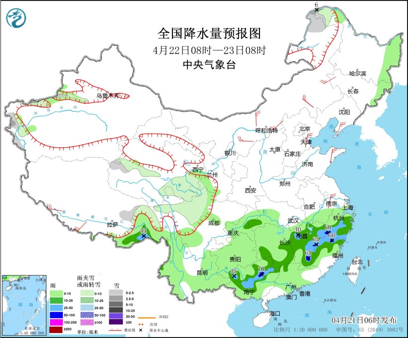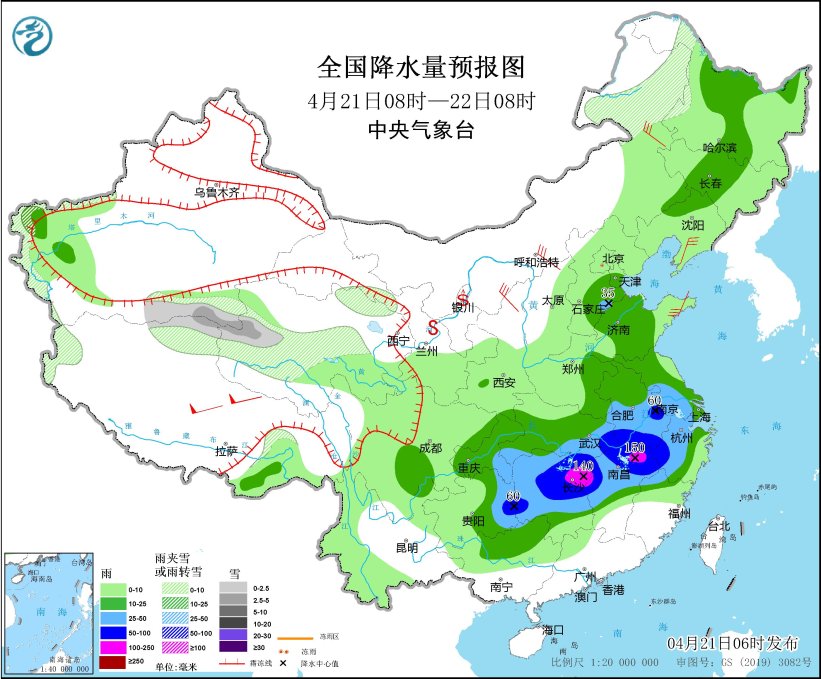 4月21日08时至22日08时,内蒙古东北部、黑龙江西北部、新疆南疆盆地和西部山区、西藏北部、青海北部和西部等地部分地区有小到中雪或雨夹雪。东北地区中部、华北东部、黄淮东部、江淮、江汉、江南大部、华南北部以及四川东南部、重庆、贵州东部等地部分地区有中到大雨,其中,安徽中南部、湖北东北部、湖南中北部、江西北部、浙江中西部、贵州东部等地部分地区有暴雨或大暴雨(100~150毫米)。西藏北部、内蒙古中东部、陕西北部、辽东半岛、山东半岛等地部分地区有5~6级风,阵风7~8级。