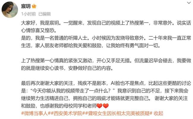 当晚,宸玥在社交媒体上发文回应,称自己是一名普通的听障人士,多年来一直正常生活,得到了家人、朋友和老师的关爱与鼓励。她对突然走红感到紧张又激动,但也明白流量终将消退,她将继续安心学习,做好自己的事情。她感谢大家的关注和支持,并表示会继续努力提升自己,拥抱自己的不足。