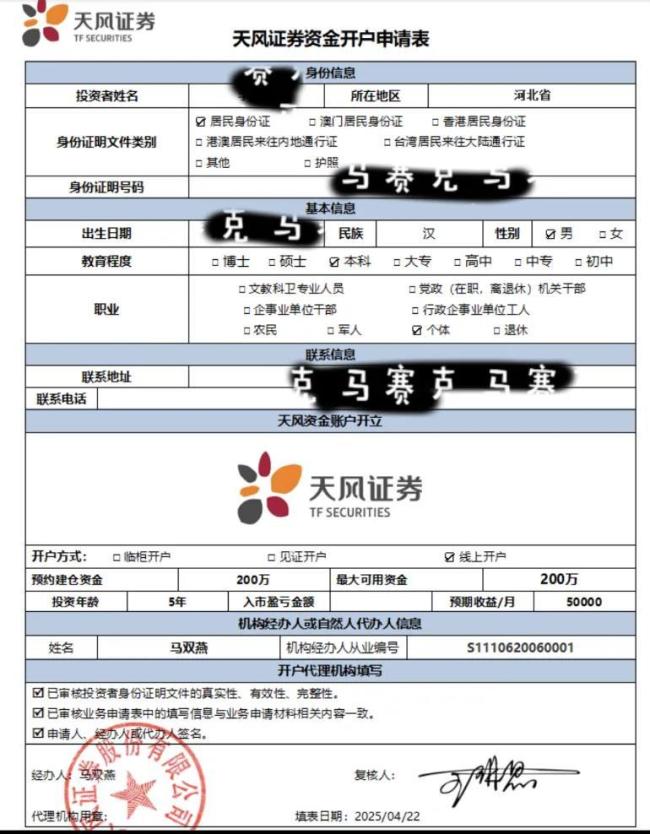 取得信任后,诈骗团伙便开始准备收割,他们会以”开通子账户”为由,要求投资者填写看似正规的证券申请表,继而引导下载仿冒券商APP。这些山寨APP界面与正规软件高度相似,但暗藏玄机。当投资者将资金转入指定账户后,便再也无法转出,诈骗团伙会立刻转移资金,完成收割。