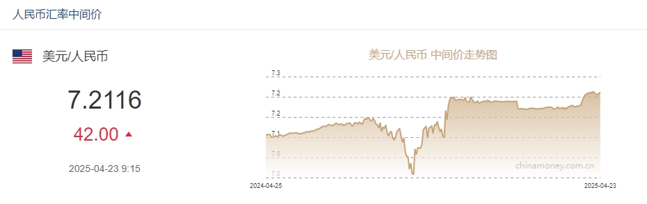 中新网4月23日电 据中国外汇交易中心网站消息,中国人民银行授权中国外汇交易中心公布,2025年4月23日银行间外汇市场人民币汇率中间价为:1美元对人民币7.2116元,下调42个基点。图源:中国外汇交易中心网站截图