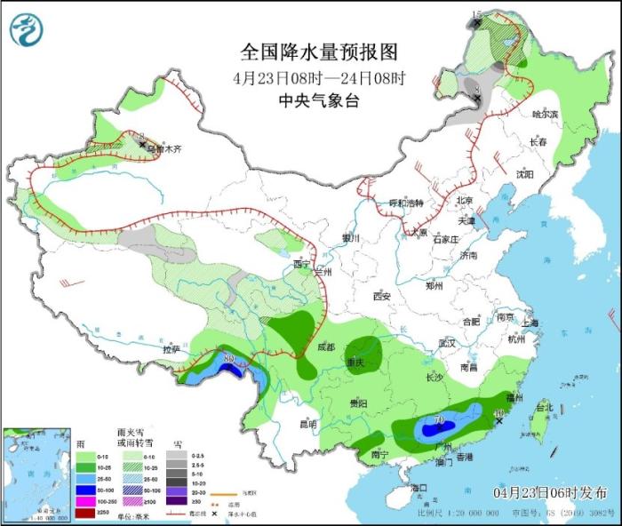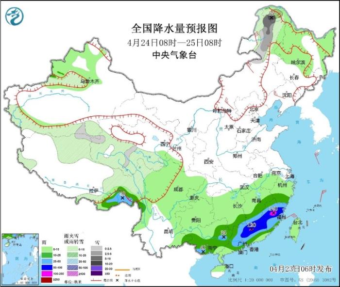 其中23-25日,江南南部、华南等地部分地区有大到暴雨,局地大暴雨,并伴有短时强降水、雷暴大风或冰雹等强对流天气。降水面弱点强,强降雨集中时段为23日夜间至24日。