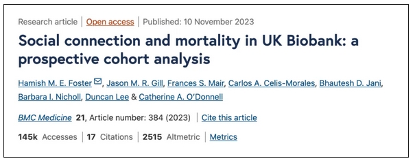 [1] Foster HME,Gill JMR,Mair FS,Celis-Morales CA,Jani BD,Nicholl BI,Lee D,O'Donnell CA. Social connection and mortality in UK Biobank: a prospective cohort analysis. BMC Med. 2023 Nov 10;21(1):384.