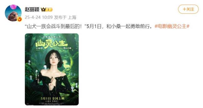 4月24日,电影《幽灵公主》官方宣布赵丽颖将为片中“小桑”一角配音。赵丽颖随后在个人微博发布官宣海报,并配文:“山犬一族会战斗到最后的!”她表示期待5月1日与小桑一起勇敢前行。