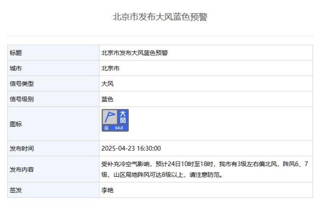 北京市气象局发布大风蓝色预警,受补充冷空气影响,24日10时至18时,北京将有3级左右偏北风,阵风可达6、7级,山区局地阵风可能超过8级。请大家注意防范。