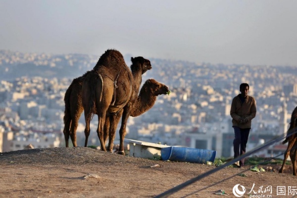 约旦首都阿曼街头的骆驼。人民网 纳达尔·达乌德摄