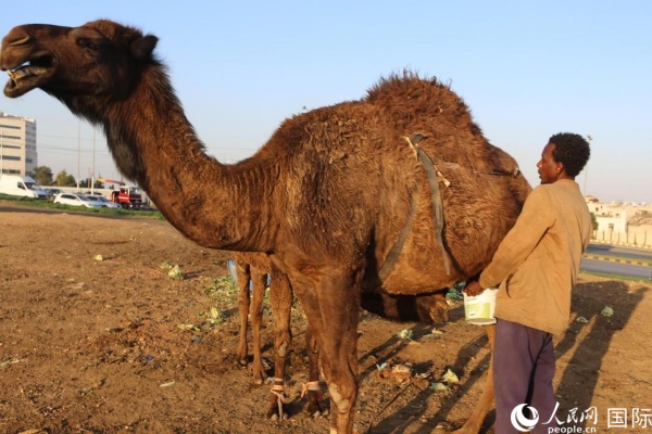 工人在给骆驼挤奶。人民网 纳达尔·达乌德摄