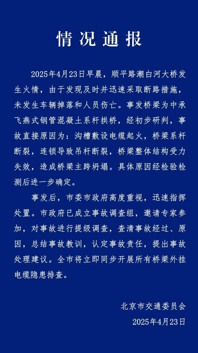 北京市交通委通报了顺义潮白河大桥事故情况。2025年4月23日早晨,顺平路潮白河大桥发生火情,由于发现及时并迅速采取断路措施,未造成车辆掉落和人员伤亡。这座桥梁是中承飞燕式钢管混凝土系杆拱桥。初步判断,事故直接原因是沟槽敷设电缆起火,导致桥梁系杆断裂,进而引发吊杆断裂,桥梁整体结构受力失效,最终造成主跨坍塌。具体原因还需进一步检测确定。