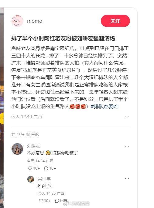 4月27日,有网友爆料排队30分钟购买网红粉时,被正在此地拍摄节目的刘畊宏团队强制清场。事件引发热议后,刘畊宏在线致歉:“不好意思,耽误你吃饭了”。