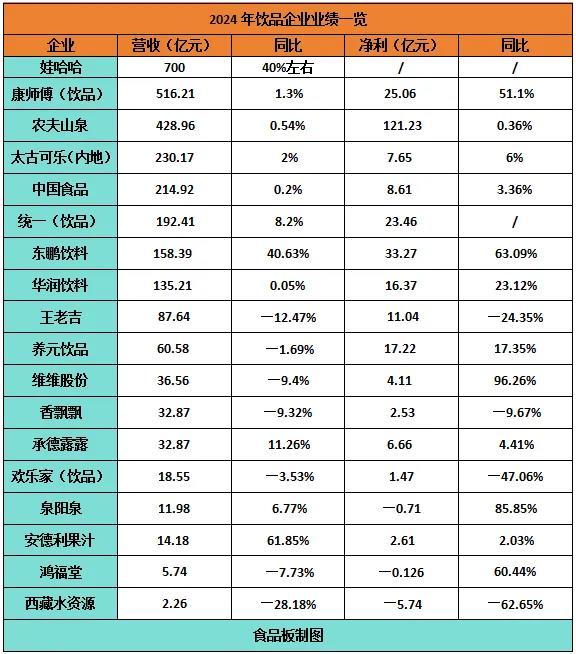 营收前三:娃哈哈(700亿元)、康师傅饮品(516.21亿元)、农夫山泉(428.96亿元)
