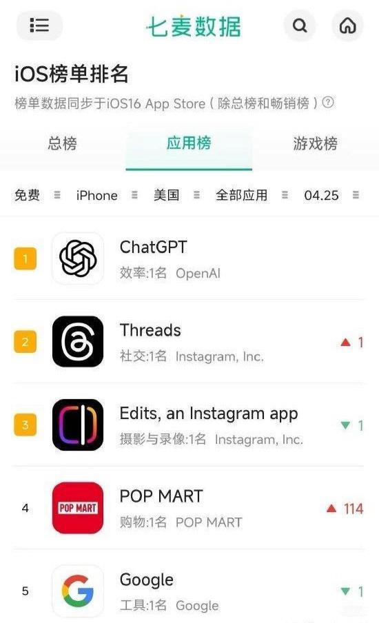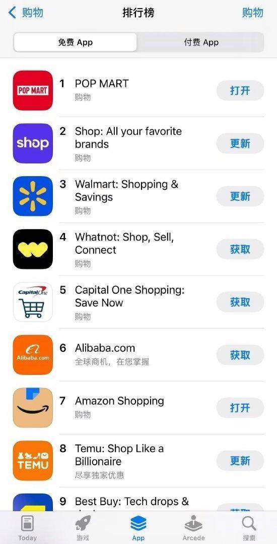 根据七麦数据,4月25日泡泡玛特官方应用登顶美国App Store购物榜,这是该应用首次在购物榜上获得第一名。同一天内,泡泡玛特App还跃升了114个位次,在免费总榜中排名第四。截至发稿时,泡泡玛特在购物榜上的排名为第六。