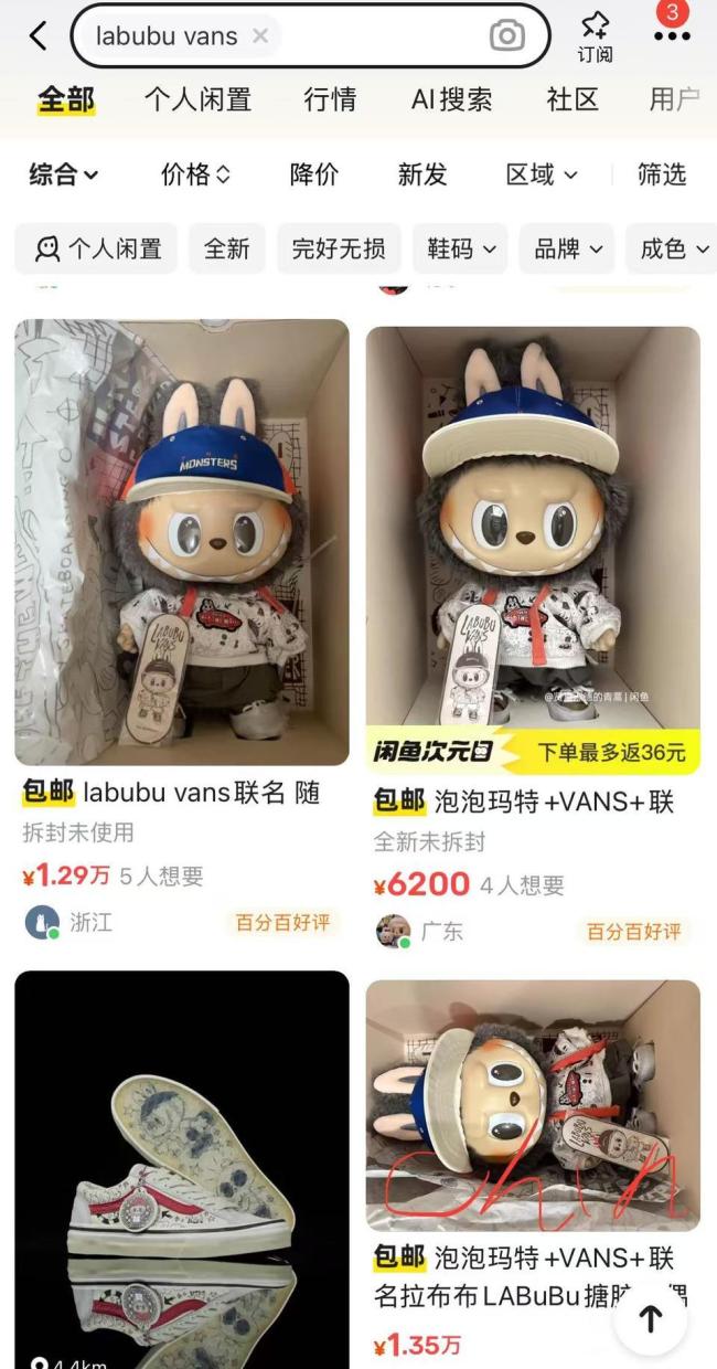 4月25日,LABUBU 3.0系列正式开启线下发售。在广州的某家泡泡玛特门店,人们排起了长队等待购买。要在线下购买该系列产品,消费者需要提前一天在线上抢到购买资格。此前,LABUBU发布的一些热门系列在二手市场上的价格通常会翻倍,甚至有些系列的价格可以涨到三倍以上。例如,去年发布的LABUBU与Vans联名款,原价599元的潮玩在二手市场上已经涨到了一万多元。