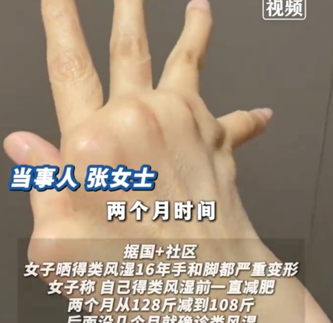 女子晒16年类风湿的手脚。4月26日,辽宁大连。女子晒得类风湿16年手和脚都严重变形。女子称,自己得类风湿前一直减肥,两个月从128斤减到108斤,后面没几个月就确诊类风湿,手和脚不知不觉就变形了,因关节变形走不了太远的路,出门想喝个水都费劲,呼吁大家一定要爱惜身体。
