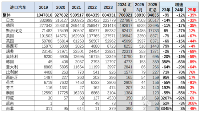 2025年1-3月,进口汽车数量为9.5万辆,同比下降39%,这是近年来少见的大幅下滑。其中,3月进口车3.9万辆,同比下滑27%,但相比之前有所改善。根据文中数据,2025年1-3月进口车最多的国家依次是日本30517辆、德国23695辆、斯洛伐克17733辆、美国8871辆、英国8371辆、墨西哥1443辆、瑞典1371辆、奥地利695辆、韩国359辆、意大利266辆。与去年同期相比,增量最大的是斯洛伐克1931辆、比利时98辆、波兰85辆、越南40辆、西班牙23辆。