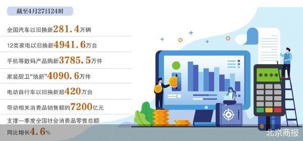 数据显示,截至4月27日24时,全国汽车以旧换新281.4万辆,12类家电以旧换新4941.6万台,手机等数码产品购新3785.5万件,家装厨卫“焕新”4090.6万件,电动自行车以旧换新超420万台,带动相关消费品销售额约7200亿元,支撑一季度全国社会消费品零售总额同比增长4.6%。特别是3月份增长5.9%,创去年以来月度最快增速。消费贡献率达到了51.7%,比去年全年提高7.2个百分点。