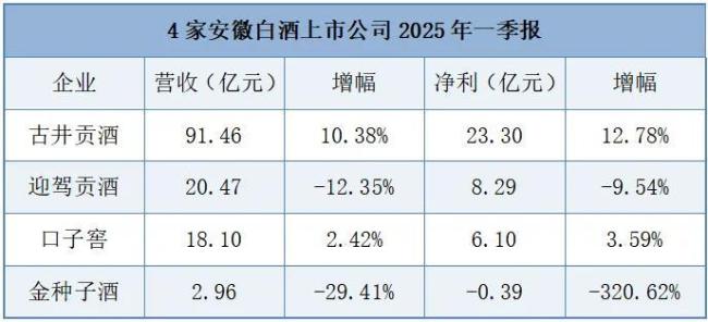 随着2024年年报及2025年一季报的披露,安徽四家白酒上市公司——古井贡酒、迎驾贡酒、口子窖、金种子酒的业绩表现逐渐清晰。在消费需求疲软、行业竞争加剧的背景下,徽酒四强呈现“强者恒强、分化加剧”的格局,既有古井贡酒持续领跑、迎驾贡酒稳居次席的亮点,也有金种子酒深陷亏损的困境。他们各自都在经历着属于自己的“突围战”。