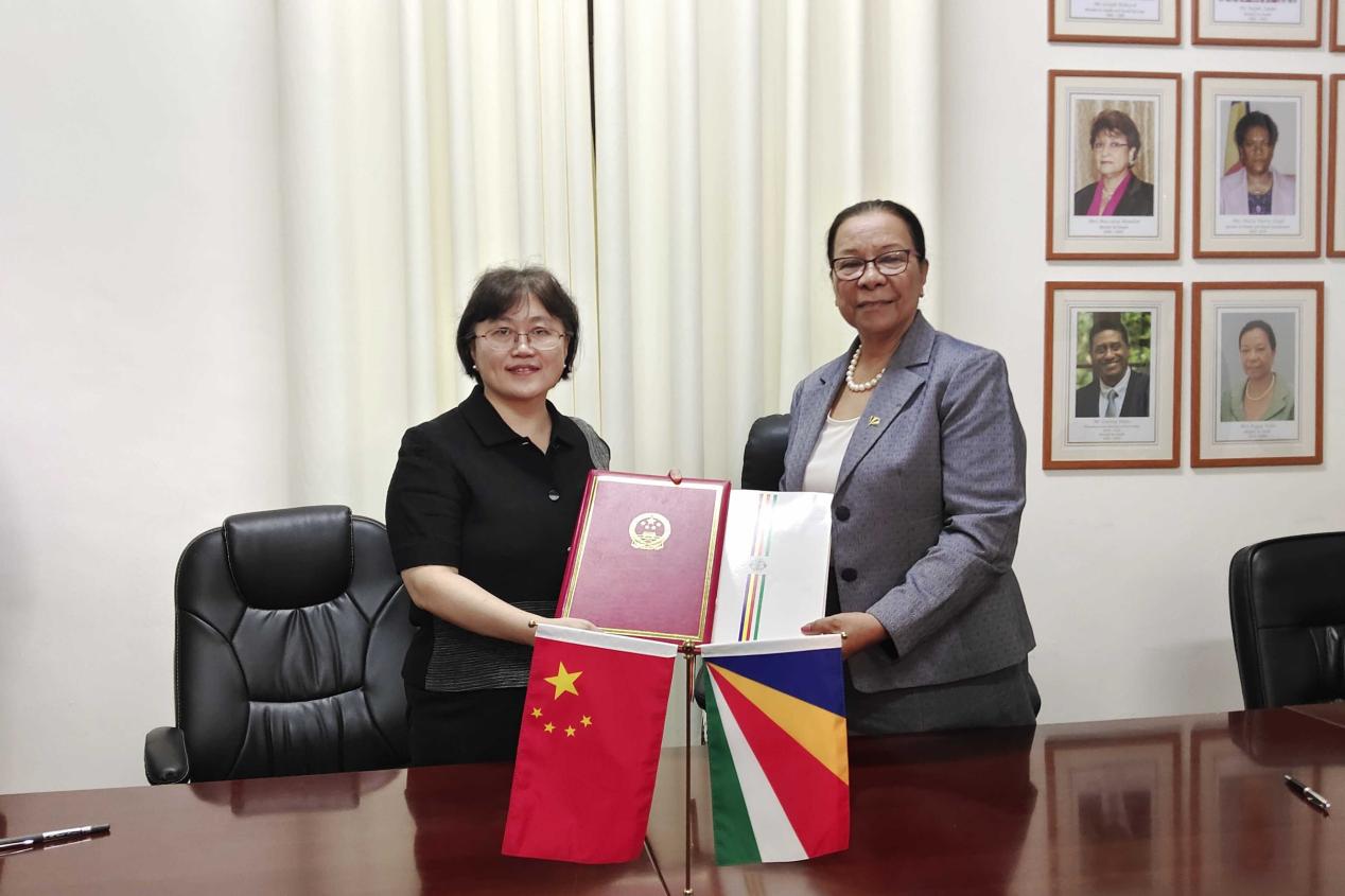 中国驻塞舌尔大使林楠与塞舌尔卫生部长维多分别代表两国政府签署中国援塞医疗队议定书(2024-2028)。驻塞舌尔使馆供图