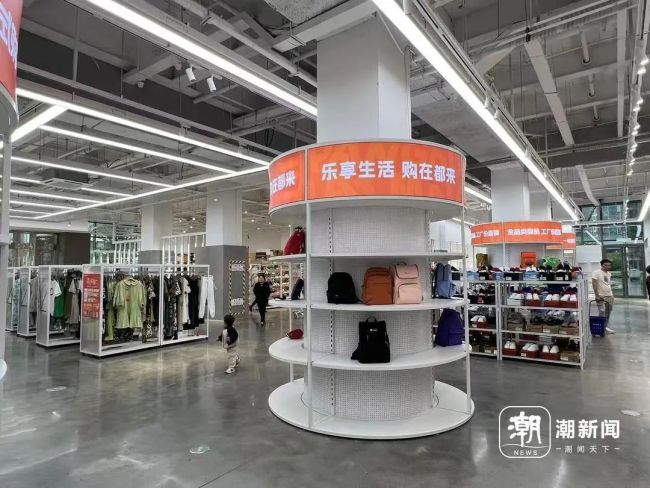 走进商场A区,可以看到一个大型服装卖场,分为男装区、女装区、婴童区、内衣区和鞋包区等。商品种类丰富,各个区域都配置了试衣间。货架上贴着“全品类商品,工厂价直销”的标语,门口也放置了不少购物车供消费者使用。现场有不少消费者正在挑选商品,有些人的购物车上堆得满满当当。