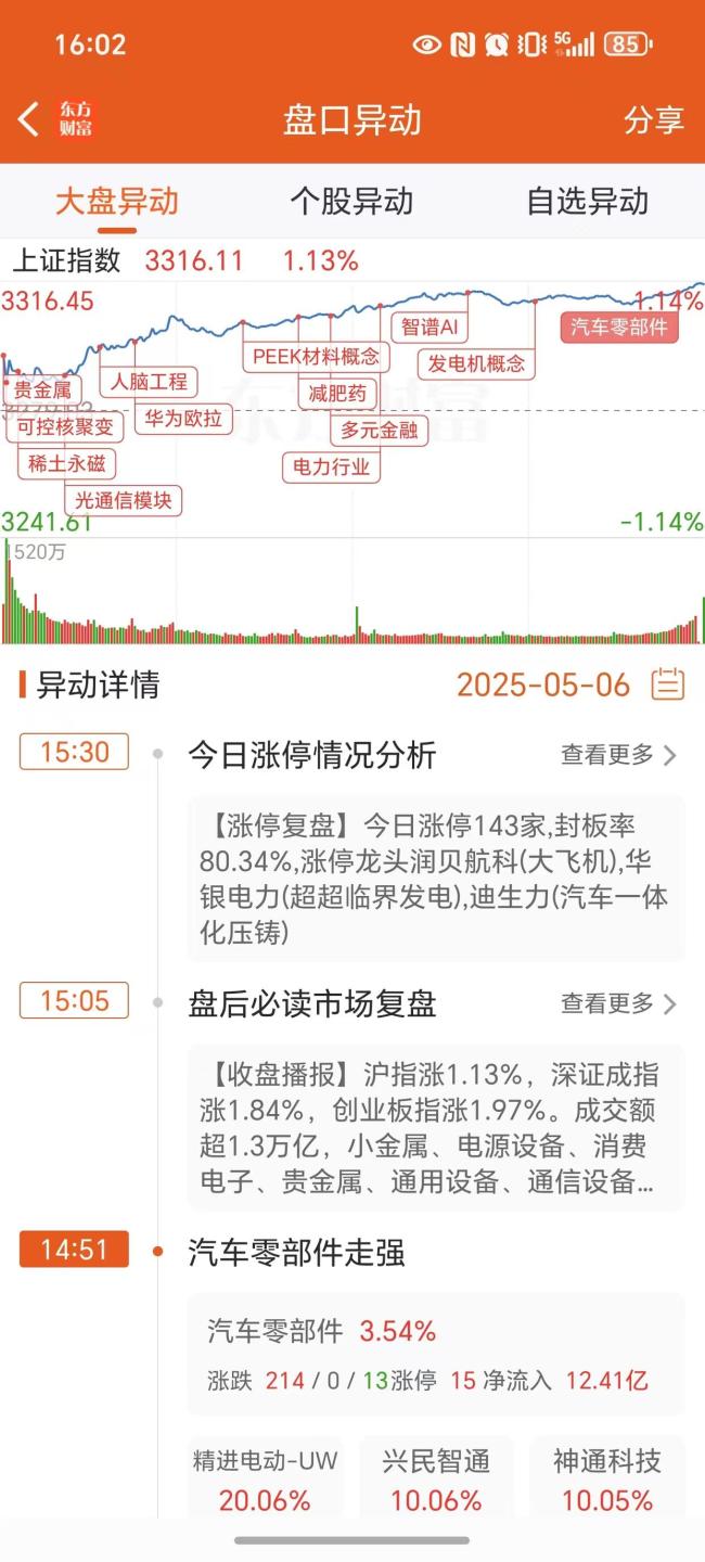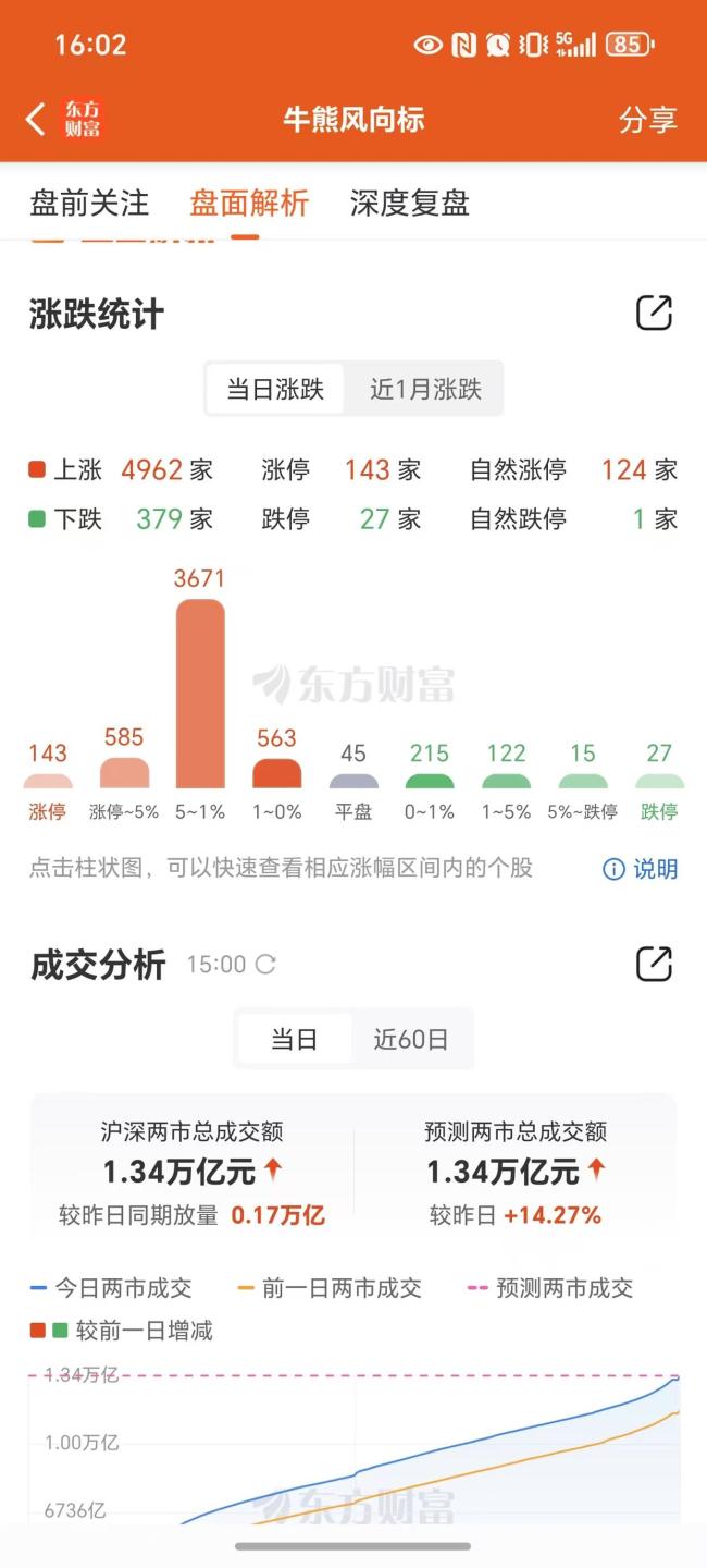 今日两市个股涨跌比为13.09:1,涨停143家,跌停27家。板块方面,13个板块异动活跃,无板块走弱。热点题材板块走势火热,赚钱效应显著。不过,这种赚钱效应能否持续,还需观察量能是否能持续放大。
