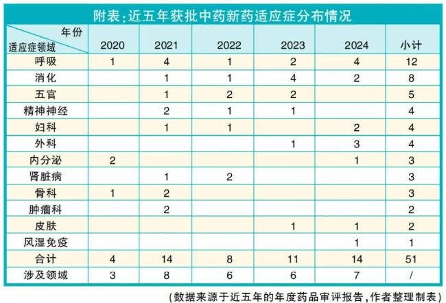 根据国家药监局发布的年度药品审评报告,近五年,国家批准的中药新药适应症领域总共涉及12个领域,其重点领域从肿瘤、精神神经、骨科、五官、肾脏逐步向消化和呼吸道领域倾斜。其中,呼吸系统疾病领域近五年每年都有新药获批,2021年及2024年该适应症领域获批新药分别达到4个,近五年共获批新药总数12个,占获批上市新药的23.53%。消化领域新药获批申请数量暂居第二,近四年都有新药获批上市。近五年获批中药新药适应症分布情况详见附表。