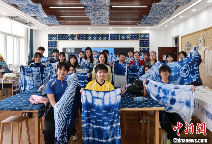 香港学生展示扎染作品。张冰 摄