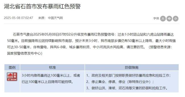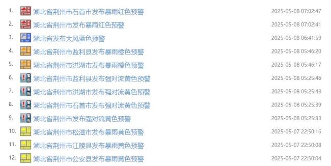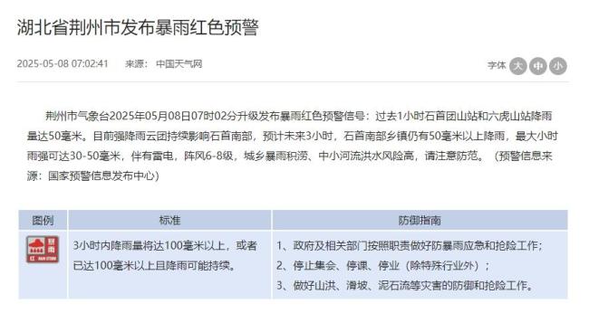 湖北荆州发布暴雨红色预警 预警连发升级