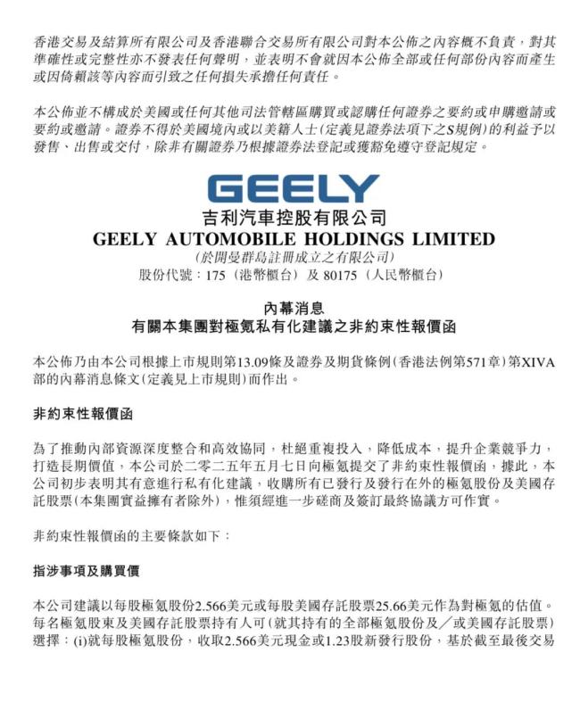 此次要约定价为每股普通股2.566美元,或每股ADR折合25.66美元。极氪股东可自主选择“全额现金”或“全部新发行吉利普通股”两种对价方案,每股极氪普通股可兑换1.23股吉利普通股、每股ADR可兑换12.3股。如未及时作出选择则默认接受现金对价。