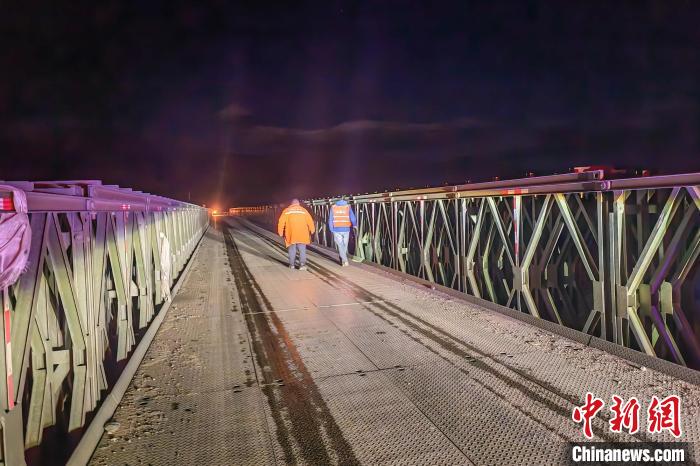 图为5月12日凌晨地震后,养护人员对拉孜雅鲁藏布江临时保通钢架桥进行检查。西藏自治区交通运输厅 供图