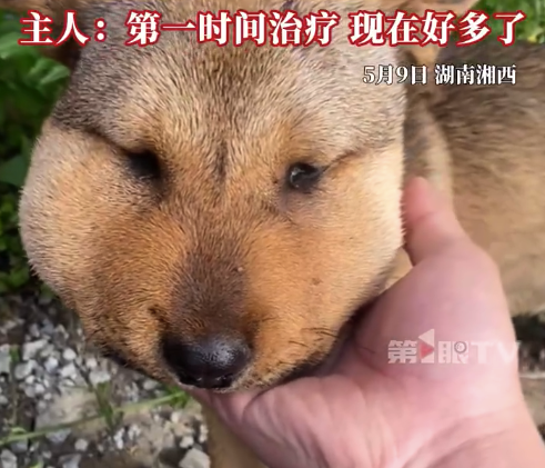 5月11日湖南湘西。小黄狗半夜上山玩,不慎被蛇咬伤脑门,肿成表情包,主人:第一时间喂药,马上给它排毒,现在情况好多了,这已经是小黄狗第二次被蛇咬了。