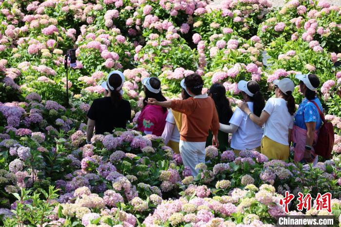 5月12日,贵州惠水,游客在绣球花海中拍照。刘美伶 摄