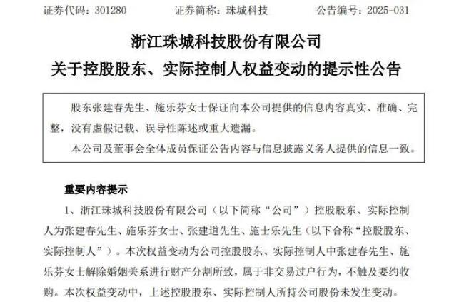 需要注意的是,珠城科技3月28日发布2024年年报时,张建春和施乐芬还是夫妻关系,还不到一个半月,两人“官宣”离婚。