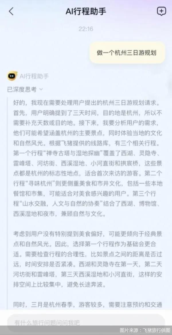 今年以来,火爆全网的DeepSeek,在旅游圈内掀起智能化浪潮。3月5日,飞猪“AI行程助手”上线,该产品集成了DeepSeek—R1及阿里云通义千问旗下主力模型的能力,是在线旅游行业首个融合多个大模型的AI产品。今年2月,马蜂窝、同程旅行等在线旅游平台也陆续接入DeepSeek。