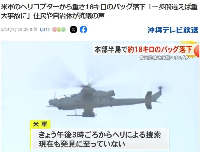 中新网5月15日电 综合日媒报道,当地时间13日,驻日美军一架直升机在冲绳本岛北部上空飞行时,掉落一个装有可燃物、重18公斤的袋子,引发当地民众强烈不满和抗议。