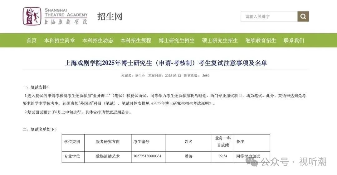 5月12日,上海戏剧学院公布了2025年博士研究生(申请-考核制)复试名单,