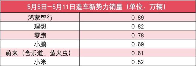 新势力5月第二周销量榜:问界重回前三,小米连续三周下滑