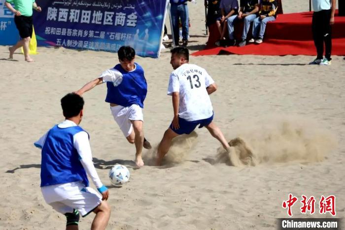 中新网乌鲁木齐5月15日电 (陶拴科 黄柏菊)初夏,在塔克拉玛干沙漠边缘的新疆和田县,一群青年在沙丘间追逐足球,场边飘来烤羊肉的香气与欢快的麦西来甫旋律。