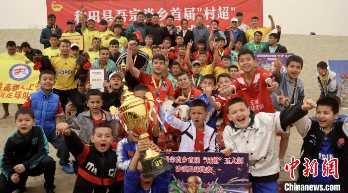 和田县吾宗肖乡首届“村超”五人制沙漠足球赛颁奖现场。(资料图)受访者供图