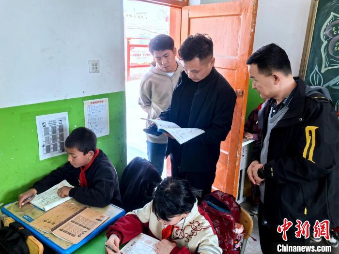 欧睿青(中)在和田县吾宗肖乡学校调研。受访者供图