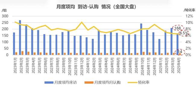 根据明源营销院统计的四月数据显示,4月全国项均到访数168组,项均认购14组,来访及认购均下滑了20%,而相较于去年四月同期表现基本持平,涨幅基本在2-5%,市场延续止跌回稳的弱复苏的态势。