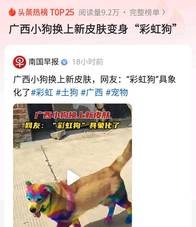近日,一只来自广西的小狗因其独特的“彩虹皮肤”在社交平台迅速走红,引发网友关注。5月14日,一段广西小狗毛发被染成彩虹色的视频在抖音上发布,视频中的小狗在乡间小路漫步,七彩的毛发十分吸睛。