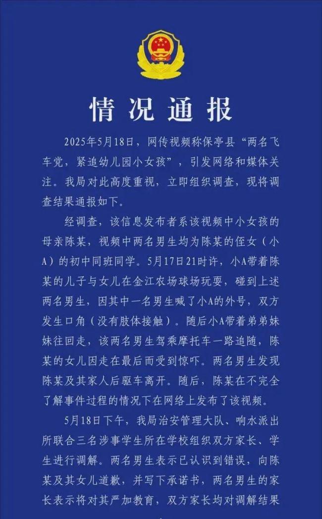 5月19日,海南省保亭黎族苗族自治县公安局发布警情通报,回应网传两名飞车党紧追小女孩的情况。经调查,该信息发布者是视频中小女孩的母亲陈某,视频中的两名男生是陈某侄女小A的初中同班同学。5月17日21时许,小A带着陈某的儿子和女儿在金江农场球场玩耍时碰到这两名男生。因其中一名男生喊了小A的外号,双方发生口角但没有肢体接触。随后小A带着弟弟妹妹往回走,两名男生驾乘摩托车一路追随,导致陈某的女儿受到惊吓。发现陈某及其家人后,两名男生驱车离开。陈某在不完全了解事件过程的情况下在网络上发布了该视频。